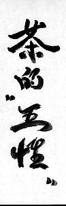 Regen und Nebel sowie Sonnenschein Chang Tie Chun (Ming-Dynastie) *Wu Hsien ...In der taoistischen Philosophie die Verkörperung der fünf Kategorien natürlicher Aktivität, die durch die Erde, Metall, Wasser, Holz und Feuer symbolisiert werden. Nach den Vorstellungen der Taoisten müssen die fünf Aktivitäten in Harmonie miteinander wirken, um so ein optimales Einsetzen der Kräfte zu ermöglichen und ein harmonisches Ganzes hervorzubringen. Ein Lied vom Tee