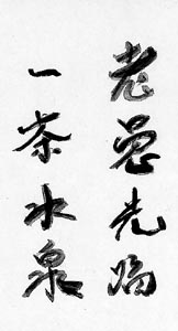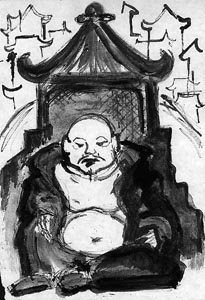 Als ich den Tempel des Westlichen Turms erreichte, Find' ich ihn verlassen und menschenleer. Wo einst adlige Herren sich trafen zu froher Gesellschaft Und Teemeister Los gastlicher Wohnsitz war. Im alten gemäuer, umwuchert von Unkraut, Wohnen Frösche jetzt Und Fische im verlassenen Brunnen. Und doch - ein Hauch vergangener Größe