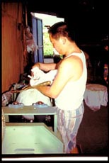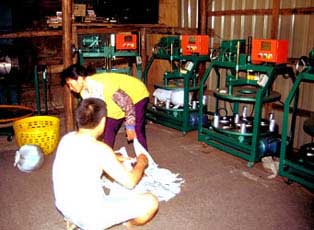 Beim "Steaming Tea" (gedämpfter Tee) werden die frisch gepflückten Teeblätter kurz mit heißem Wasserdampf behandelt, manchmal taucht man die Blätter auch kurz in ein siedendes Wasserbad. Beim "Panroasting Tea" (Pfannengerösteter Tee) wird das frischgepflückte Blattgut auf riesigen Rundblechen kurz erhitzt. Dadurch wird eine Fermentation des Tees unterbunden. Nach dem "Welken" des Blattguts wird der Tee auf großen Blechen ausgelegt und gerollt. Das gerollte Blattgut kommt nun zum Rösten in eine große Mischtrommel, die mehrere Heizstäbe enthält. Durch ständiges Drehen der Trommel wird das Blattgut in einem Heißluftstrom bei ca. 90°C gehalten und verliert dabei den größten Teil seines Gewichts - Wasser wird den Pflanzenzellen entzogen. Je nach Sorte wird dieser Vorgang des Rollens und daran anschließend das Rösten mehrmals wiederholt. Wenn das Blattgut seine letztendliche Konsistenz erreicht hat, wird es zum Sortieren gebracht. Bei einfacheren Sorten geschieht das mittels sogenannter Rüttelmaschinen, bei hochwertigen Tees wird per Hand sortiert. Herstellung von OolongteeDie Oolongtee-Herstellung gehört mit zu den kompliziertesten und aufwendigsten Verfahren zur Teeherstellung. Oolongtees sind im Vergleich zu Grüntees noch verhältnismäßig neu. Man kennt diese Tees erst seit der Ming-Ära. Nach dem Pflücken wird das Blattgut für ca. 1 Stunde auf großen Tüchern dem Sonnenlicht ausgesetzt, so daß eine leichte (natürliche) Fermentation (das sogenannte Anwelken) einsetzt. Bei manchen Oolongsorten wird zwecks besserer Anfermentierung das Blattgut in Bambuskörben geschüttelt, so daß die Blattränder aufreißen und der Zellsaft austreten kann. Die Teeblätter beginnen jetzt einen unsagbar süßen Duft zu verströmen und werden auf runden Bambusplatten ins Innere gebracht um, je nach Sorte, noch weiter zu fermentieren bzw. gleich weiterverarbeitet zu werden. Das angwelkte Blattgut wird in die Heiztrommel gefüllt und für ca. 45 Minuten bei 70°C getrocknet. Danach wird das heiße Blattgut in saubere Baumwolltücher geschüttet, die zu einem großen handlichen Ballen geschnürt werden und in einer Knet- und Walkmaschine ständig gerollt werden. Dieser Vorgang dauert ca. 20 Minuten. Das Blattgut wird wieder zurück in die Heiztrommel geschüttet und erneut erhitzt. Je nach Teesorte wird das ganze bis zu 10mal wiederholt. Am Ende des Verarbeitungsprozesses hat man ein stark und fest gerolltes Blattgut, was noch einem Abschluß-Röstvorgang ausgesetzt wird, um den Tee haltbar zu machen. Bei besseren Oolongs werden nun noch per Hand die Stiele abgeknipst und aussortiert. |