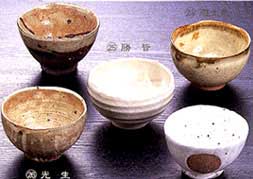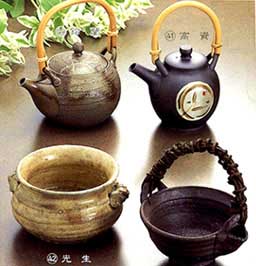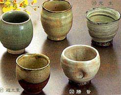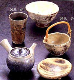 Neben den Tokonami-Kännchen gibt es im südlichen Teil der Haupinsel Honshu eine lange Tradition der meisterhaften Verarbeitung einheimischer Terrakotta-Erden. Diese Keramiken, E-Shino genannt, zeichnen sich durch ausgesprochen raffinierte, unikale Glasuren und Brandmuster aus - die Farbpalette reicht dabei vom verhaltenen Ocker über Zinnoberrot, Olivgrün bis in die vielen Varianten des Grau und Schwarz. |