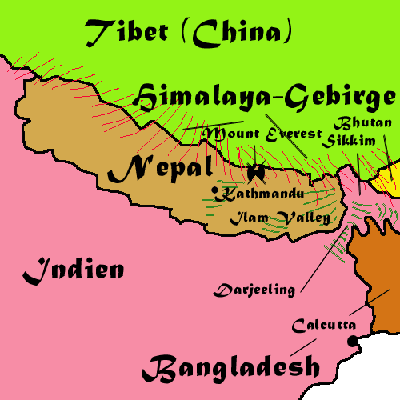 Das Hauptanbaugebiet für Tee befindet sich im äußersten Osten des Himalaya-Königreichs, im Ilam-Valley. In direkter Nachbarschaft zu den klassischen, indischen Hochlandregionen Darjeeling, Terai und Dooars ziehen sich entlang dieses zauberhaften Tals zahlreiche kleinere Teegärten entlang. Tee wird weiterhin im Kathmandu-Tal (Zentralnepal) und in den subtropischen Flachlandregionen an der Grenze zu den indischen Unionsstaaten Bihar und Uttar Pradesh kultiviert (nur minderwertige Qualitäten). |