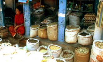Typischer Marktverkaufsstand in Patan. Hier werden alle lebensnotwendigen Dinge für den täglichen Bedarf gehandelt. |