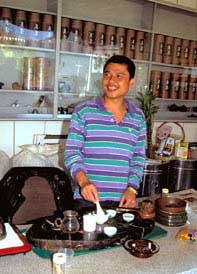 Teebauer in seinem Teegeschäft in Wu Xi |